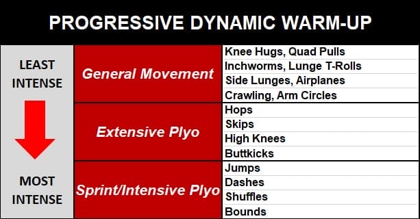 While this may be redundant information for many, some simple examples could include transitioning from extensive to intensive plyometrics (eg: Hops to Jumps) or less intensive to more intensive sprint based drills (eg: 10 yard build-ups to flying 10’s). You can choose to keep the warm up choices as specific or general as you deem fit. The point is that you want to be able to transition to the main work of your session as seamlessly as possible; maximizing your warm up for potentiation effects can be a great tool for this.